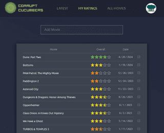 A movie rating site created for myself and my friends. Shown is the Ratings page, which is a place to manager your individual movie ratings.