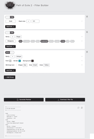 A tool used in the game Path of Exile 2, to easily create custom item filters with a more intuitive and user friendly interface. https://github.com/ryemoss/PoE2-filter-builder